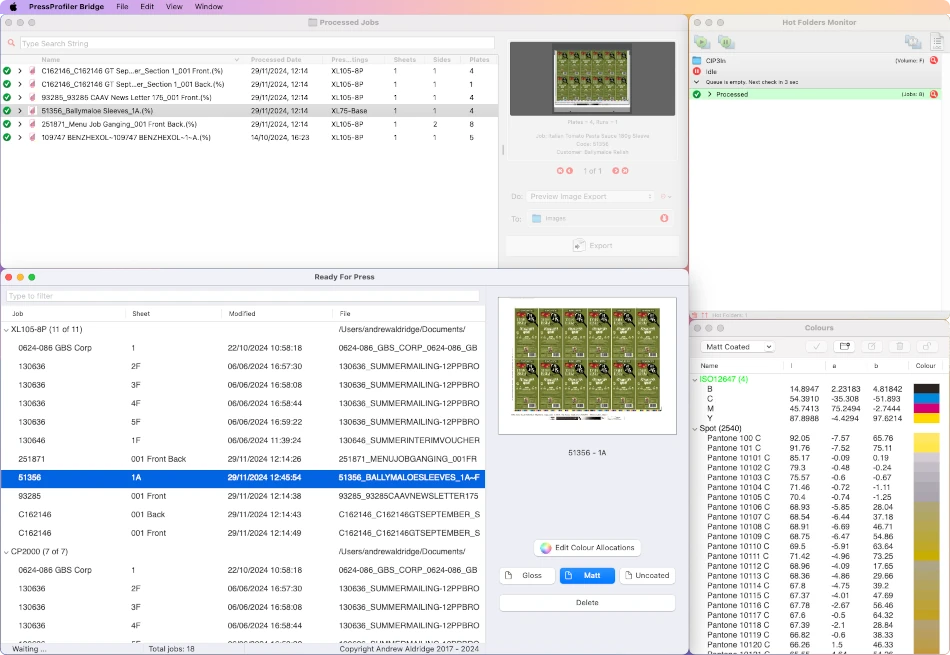 PressProfiler goes far beyond CIP3, merging in data from your MIS system provided by XML or JDF from systems such as Metrix, Pace, Tharstern, Switch, and more, to automate more of the make-ready process including paper types, paper sizes, scheduled print times, clock counters, customer details, high-resolution job previews, and more.